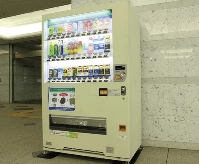 伊藤園の茶殻入りケイソウくんシートが貼られている伊藤園の環境対応型且つ消臭抗菌自販機